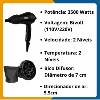 Mini Hair Dryer for Travel Bivolt 3500W + Diffuser