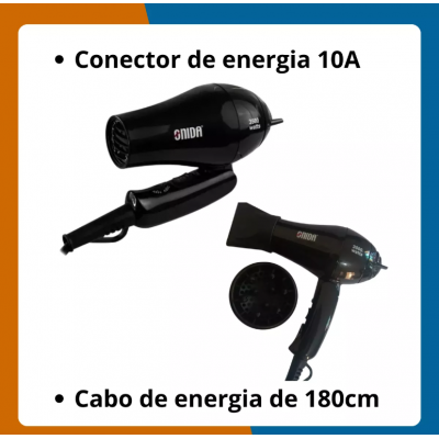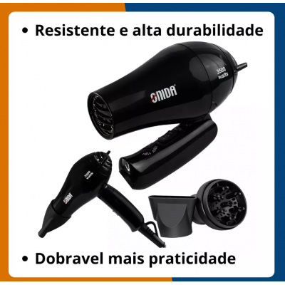 The hair dryer opens home combines power and practicality, with 3500 watts for quick and efficient drying. Its compact and light design makes it ideal for travel, with hanging handle that facilitates storage. The product is bivolt, allowing the choice between 110V and 220V through a voltage switch. The set includes an air director nozzle and a diffuser nozzle, providing versatility in use.