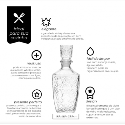 With a capacity of 800ml, this elegant bottle is made of high quality glass, providing a touch of sophistication to your bar. In addition to being ideal for storing your favorite whiskey, it also has a classic design that makes it a versatile decorative object and can be used to add a creative touch to your decoration.