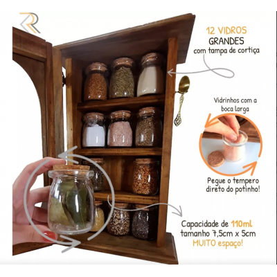 Product made with 100% recycled solid wood, with 4 shelves, supporting 12 glasses for seasoning (3 on each shelf), wooden port and hinges and metal handle, closing with a delicate spoon replacing a latch for the door (see details in the photos) so you can organize your favorite spices always at hand.