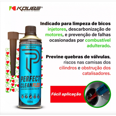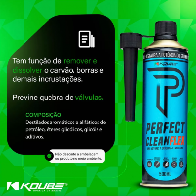 Perfect Clean Flex Koube, is a product designed for cleaning the power system, admission, and engine of combustion chamber with conventional or carbuar injection system. It has the function of removing and dissolving charcoal, dreaks and other incrusions, transforming dirt into gas microparticles, which significantly reduces excessive fuel consumption. Suitable for cleaning injectors, decalbonization of engines, and prevention of faults caused by tampered fuel. Prevents valve breaks, cylinder shirt risks and catalyst obstruction.
