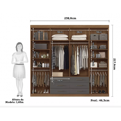 A complete wardrobe with a lot of space for all your clothes. It has 06 wide drawers that slide on metal slides, making it easier to open and close daily. It offers internal space with 04 aluminum hangers/freshmen, to hang the clothes with organization and quality, ABS handles, adding modernity to the product, and 10 large shelves to store the folded clothes.