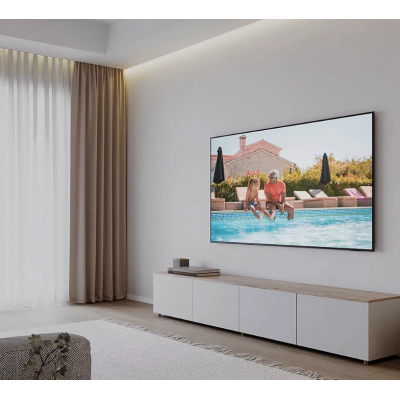 TV AirSlim design is the perfect combination of elegance and functionality. With less than 2.6cm thick, it integrates harmoniously into any environment, whether mounted on the wall or rack, with an adjustable base that fits your preference.