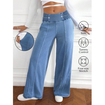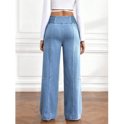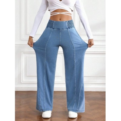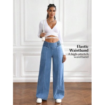 SHEIN PETITE Women's Elastic Waist Wide Leg Loose Casual Versatile Jeans