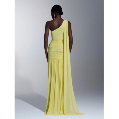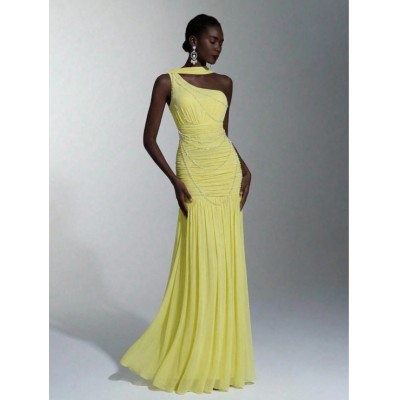 Title page > Elitara Elegant Luxurious Pearl Chain Splice Elastic Knit Net Ruched One Shoulder Halter Mermaid Dre